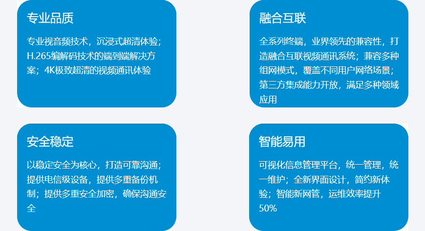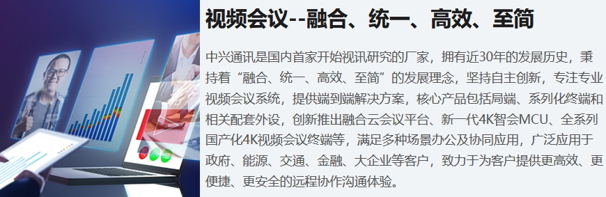 中兴通讯是国内首家开始视讯研究的厂家,拥有近30年的发展历史,秉持着“融合、统一、高效、至简”的发展理念,坚持自主创新,专注专业视频会议系统,提供端到端解决方案,核心产品包括局端、系列化终端和相关配套外设,创新推出融合云会议平台、新一代4K智会MCU、全系列国产化4K视频会议终端等,满足多种场景办公及协同应用,广泛应用于政府、能源、交通、金融、大企业等客户,致力于为客户提供更高效、更便捷、更安全的远程协作沟通体验。