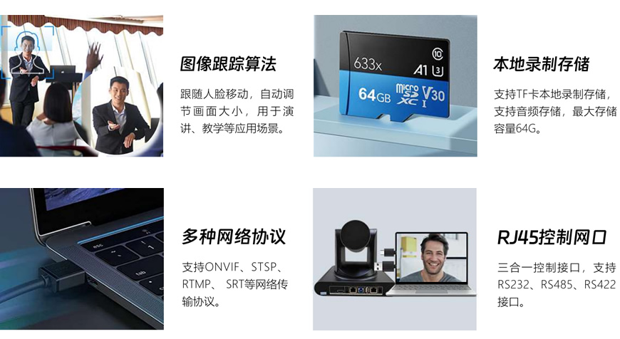 图像自动跟踪:支持图像自动跟踪功能,平滑跟踪演讲人,根据跟踪者距离远近自动变焦,调节画面大小。