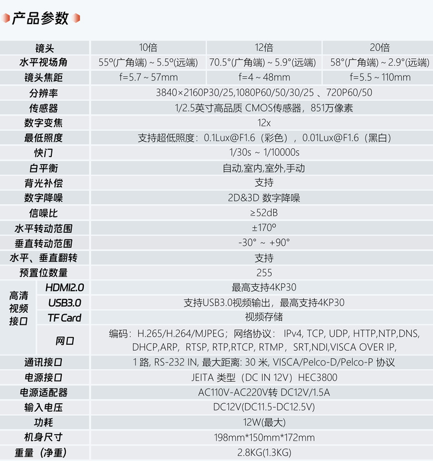 多种光学变焦镜头:具有10倍、12倍、20倍镜头可选,10倍广角55°,12倍广角70.5°,20倍广角58°。