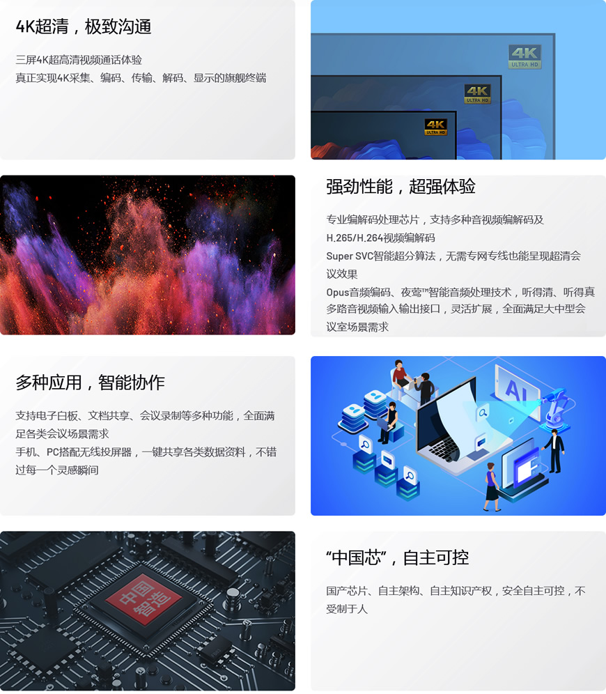 4K超清,极致沟通。三屏4K超高清视频通话体验。真正实现4K采集、编码、传输、解码、显示的旗舰终端.....