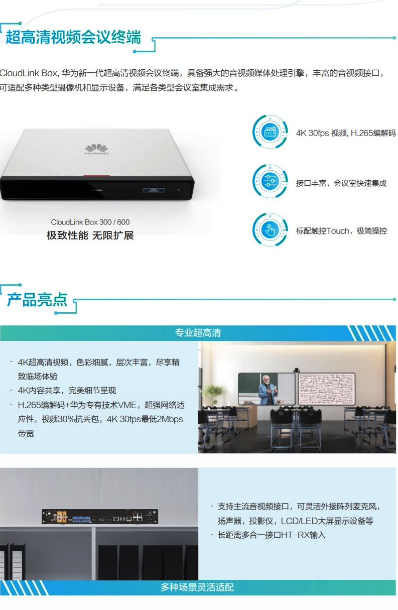 CloudLink Box,华为新一代超高清视频会议终端,具备强大的音视频媒体处理引擎,丰富的音视频接口,可适配多种类型摄像机和显示设备,满足各类型会议室集成需求。