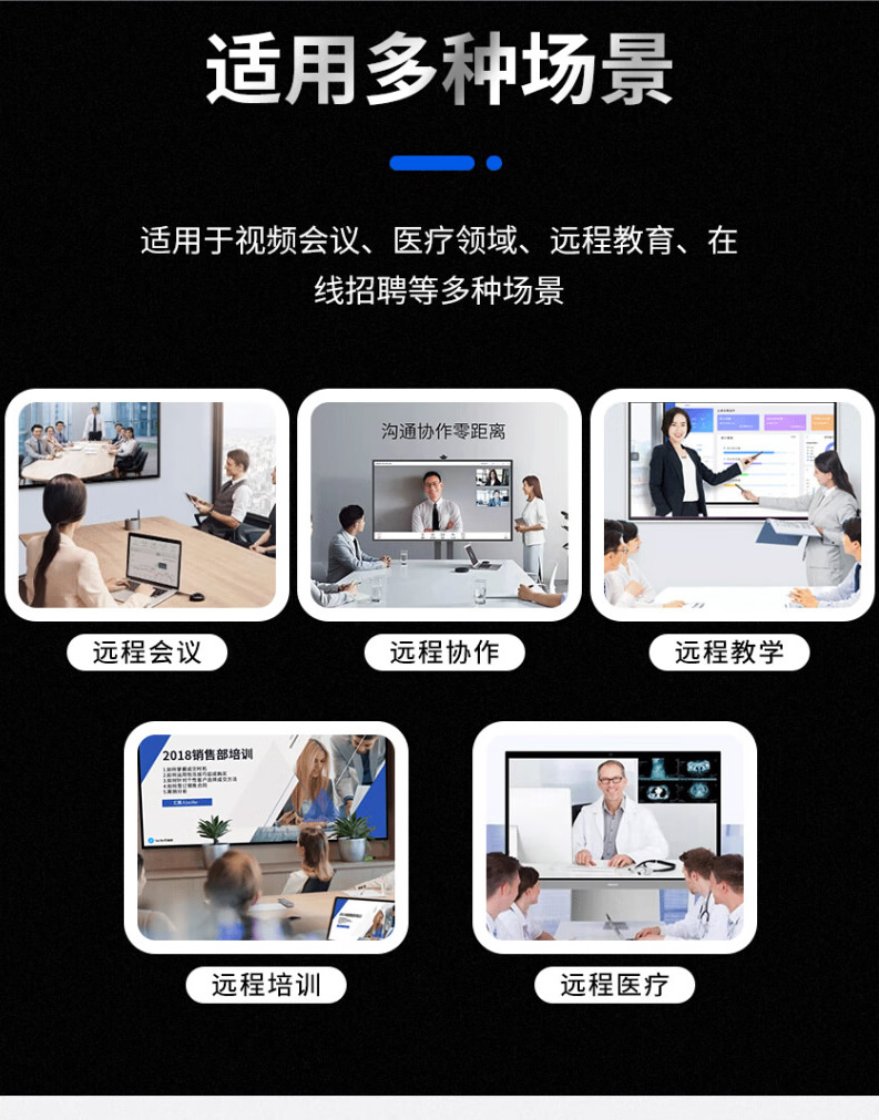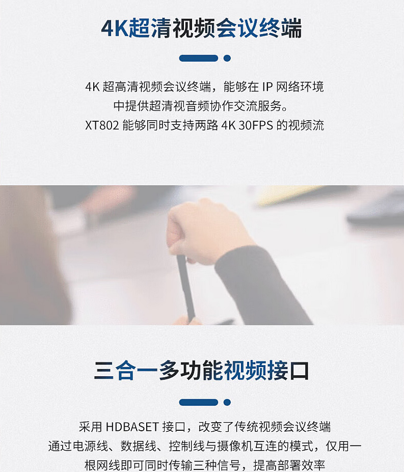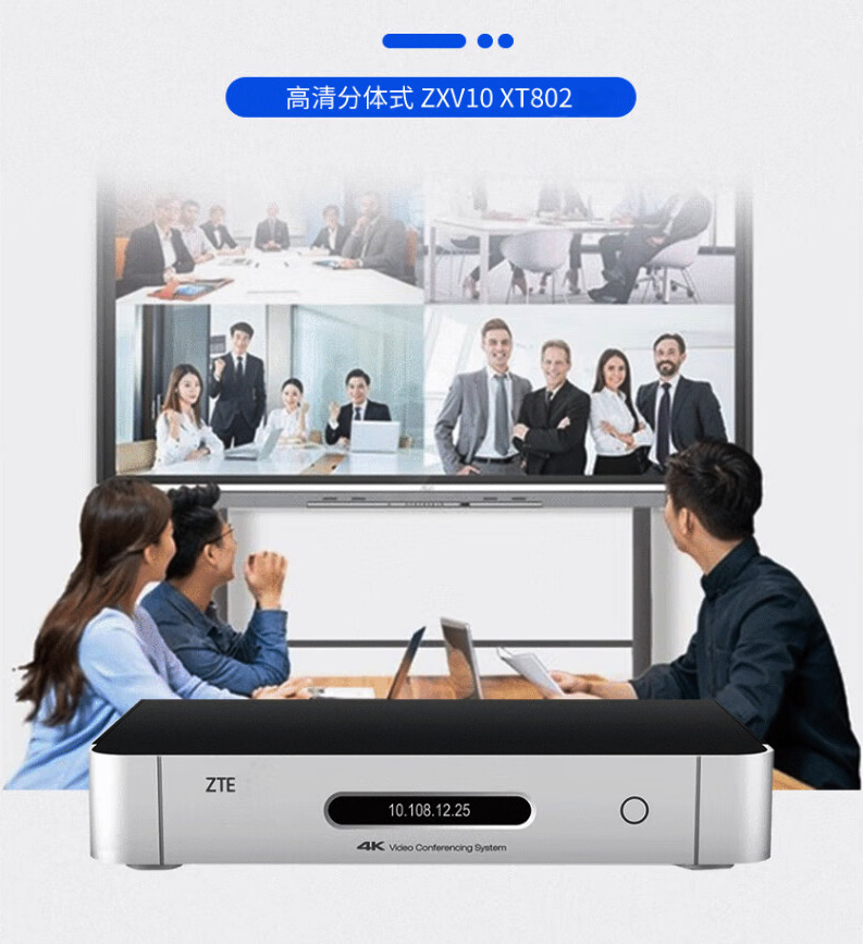 中兴通讯推出的先锋版4K超高清视频会议终端,能够在IP网络环境中提供超清视音频协作交流服务。 XT802能够同时支持两路高达4K30fps的视频流,给用户提供极致的超高清晰视频体验。XT802具有丰富的音视频接口,可用于行政会议、应急指挥、智慧金融、交通、电力、医疗、教育等各种应用场景。