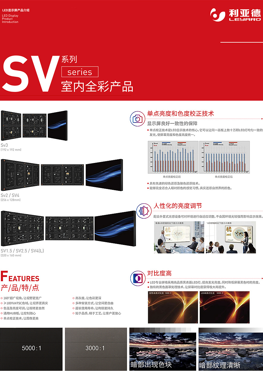 单点校正技术,人性化亮度调节,对比度高。像素间距(mm):1.5 / 1.8 / 2 / 2.5 / 3 / 4 /