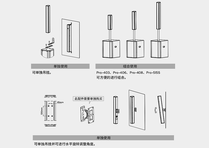 Pro系列音箱可自如调节角度,适应不同会场的安装放置要求,是多功能安装应用的理想选择。音箱可以单独吊挂使用,也能搭配可调节角度的壁挂扣吊挂使用,灵活便捷的同时有效地抑制系统的声衍射。人性化设计的壁挂扣让音箱在实际场景使用中更加方便快捷、投射距离更远,精准地还原醇厚人声。Pro系列音箱安装方式灵活多样,支持任意组合安装。在不同的场合兼顾着现场声场的环绕声效,让参与者享受丰富的听感,满足会议中心、多功能厅、宴会厅、体育馆以及舞台演出等场合的搭配需要。