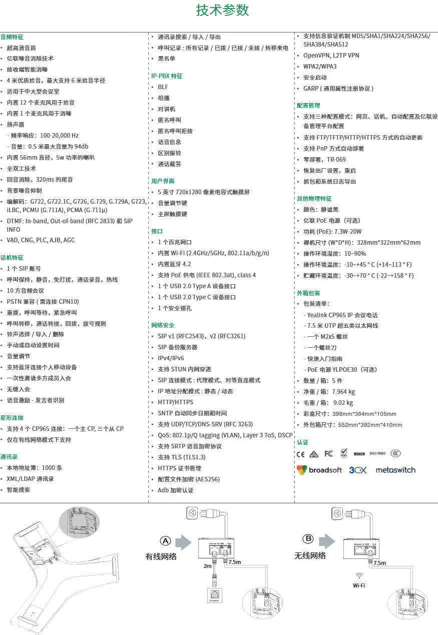 亿联 CP965 专为大中型会议室量身定制,基于安卓 9.0 系统,是一款拥有超高清音质、强大语音会议功能和简易会控操作的旗舰级会议电话。它首次采用三防网布设计,无惧液体泼洒的同时也将麦克风音质发挥到最佳。商务、内敛的设计,完美匹配了会议室沉稳的风格。防指纹液晶屏幕结合一目了然的 UI 交互页面,使得每个与会者都可以轻松控制会议。CP965内置 13 个麦克风,为您提供清晰自然的会议通话体验。此外,您还可通过蓝牙或 USB 将 CP965 与您的移动设备(例如:PC 设备,智能手机等)相连,实现多种模式 UC 混合会议。CP965 能与 3 台 CP 组成星形连接,实现同步拾音和播放,使您在大中型会议室能够体验完美会议效果。CP965 为您提供全新的智能语音会议解决方案,是您会议室的理想办公助手。