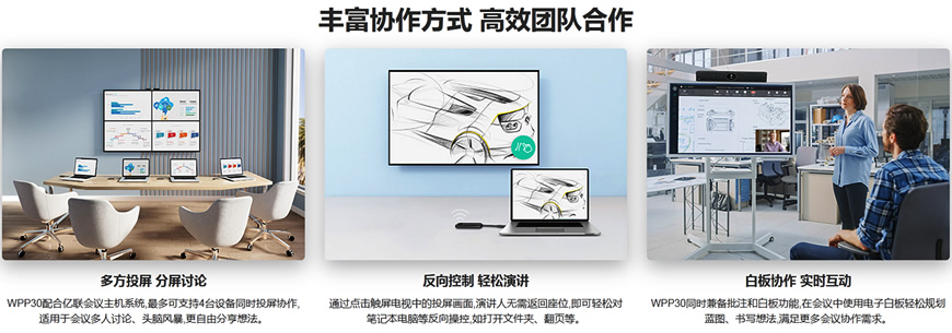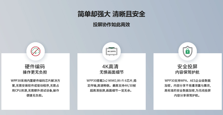 亿联全新4K无线投屏器WPP30,技术与性能重磅提升,为会议室提供更便捷丰富的投屏与协作。WPP30支持4K/30帧超高清硬件编码投屏输出,支持USB-A/全功能USB-C多接口,无需软件安装,即插即投,稳定清晰。小巧身材凭借WiFi-6高速芯片,投屏更快更流畅。同时具备USB外设模式(BYOD功能),帮你调用会议室里的亿联会议设备,运行使用多种平台视频会议。