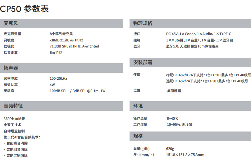 CP50搭载8单元全向麦克风阵列,支持360°环形拾音、6米拾音距离,高灵敏度及宽阔频率响应,确保优质的拾音效果;配有高品质全频扬声器,还原自然人声,让视频会议声临其境,清晰自在地交流。
