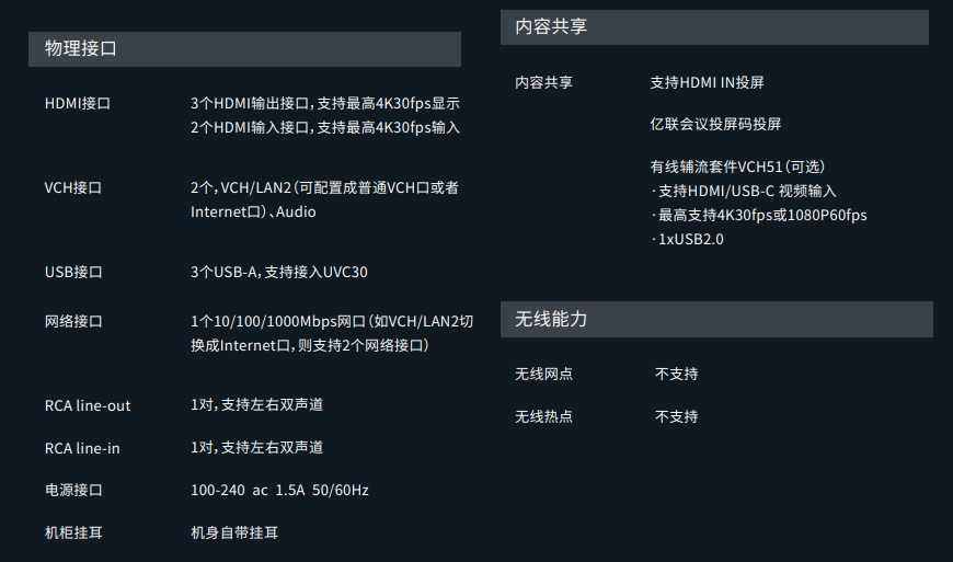 亿联MeetingEye 500 Pro 是亿联新一代视频会议主机,分体式设计,支持 4Kp30 超高清视频通话及内容分享,支持三屏高清显示,并可以自由的选择和放大显示的内容;可搭配 36 倍混合变焦的新一代 4K 超清云台摄像机,同时也支持第三方摄像机输入,满足中大型会议室各种场景需求,专业开会,重要商务洽谈沟通起来高效加倍。