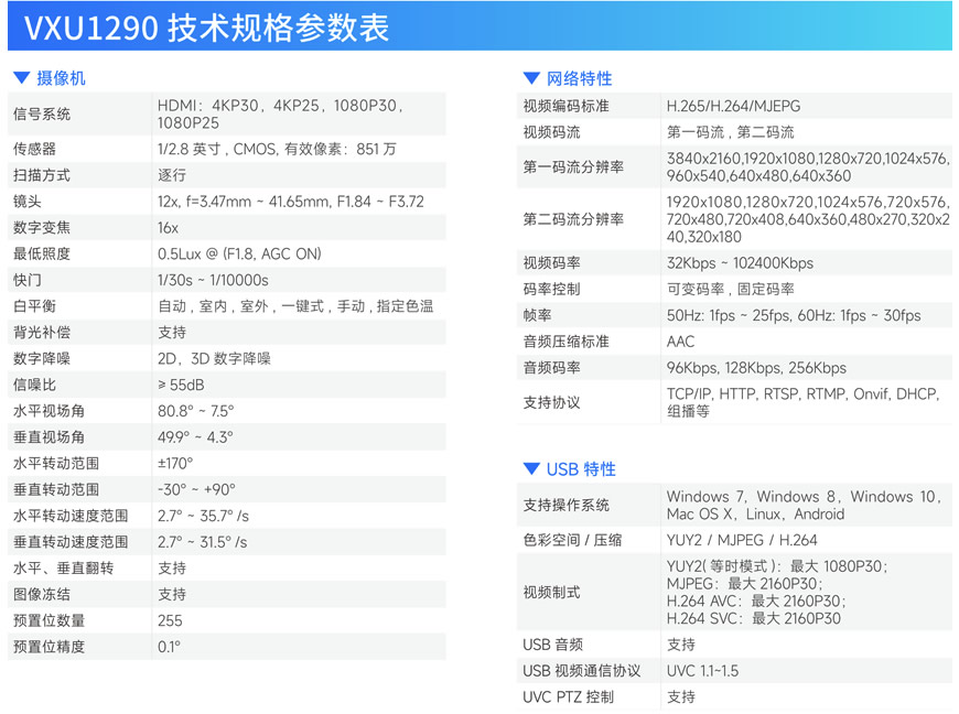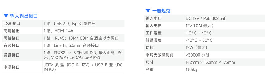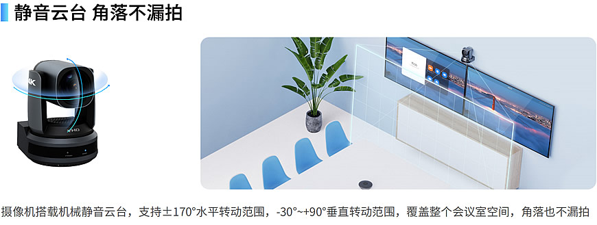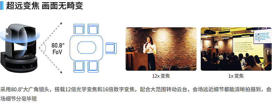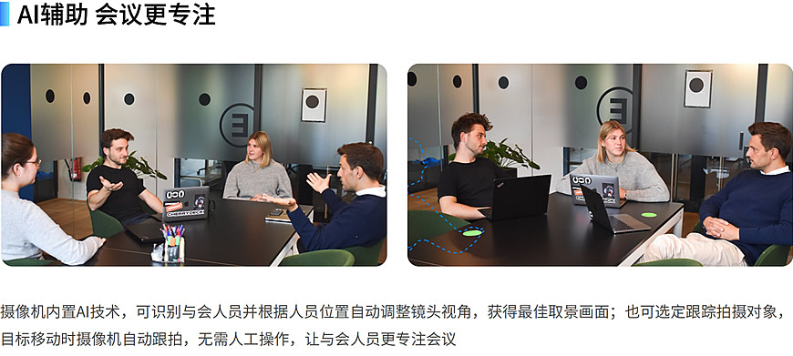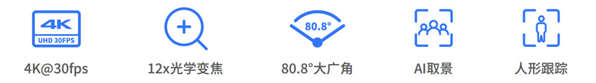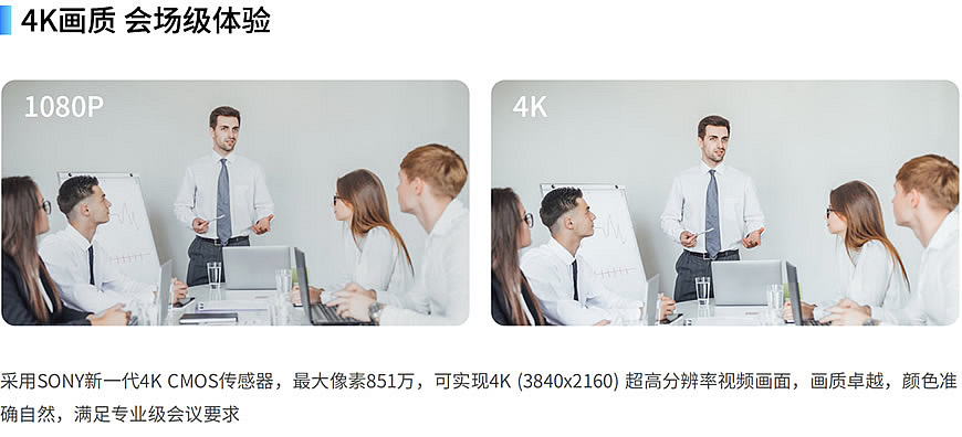 专为大中型会议场景设计的超高清视频会议摄像机,采用SONY 全新一代 1/2.5 英寸 4K CMOS 传感器,实现3840x2160超高分辨率图像画 质,带来更加细腻逼真的视频会议体验;摄像机内置AI视频算法,可识别与会人员并根据人员位置自动调整镜头视角,获得最佳取景画面; 也可选定拍摄对象,目标移动时摄像机自动跟拍,让与会人员专注会议。